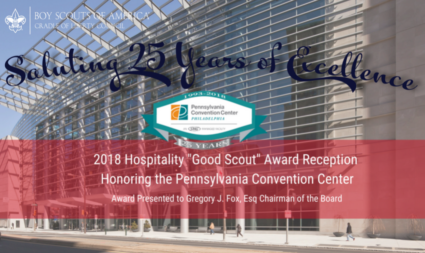 This year,Ā the Cradle of Liberty Council, Boy Scouts of America, is presenting the “Good Scout” award to the Pennsylvania Convention Center, accepted by Gregory J. Fox, Esquire, Chairman of the Board, at COLBSA’s annual Hospitality Industry āGood Scoutā Award Reception on November 1.